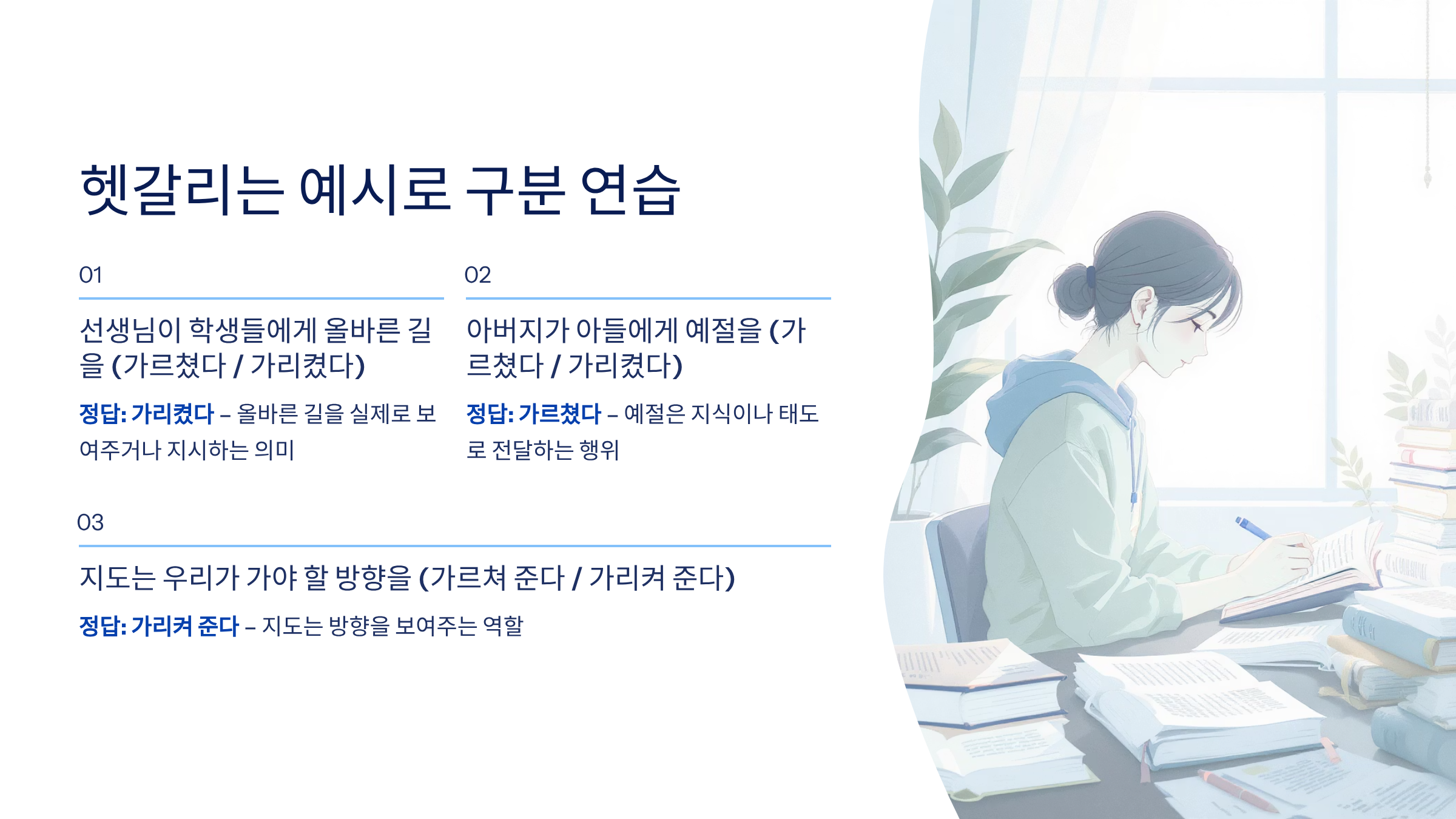 특히 ‘가르치다’와 ‘가리키다’는 발음이 비슷해 자주 혼동되는 단어 중 하나죠.