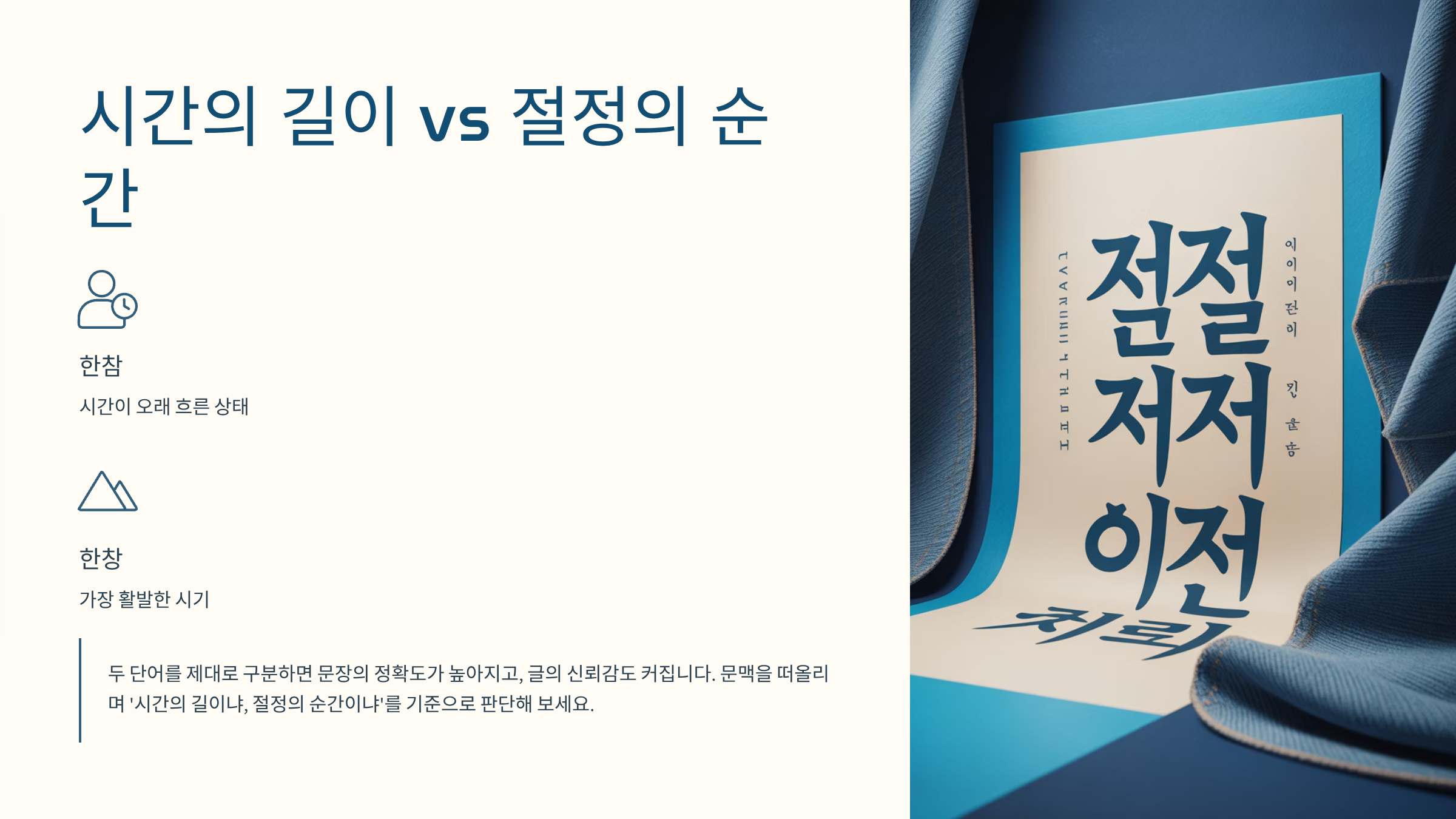 오늘부터는 문맥을 떠올리며 ‘시간의 길이냐, 절정의 순간이냐’를 기준으로 판단해 보세요.