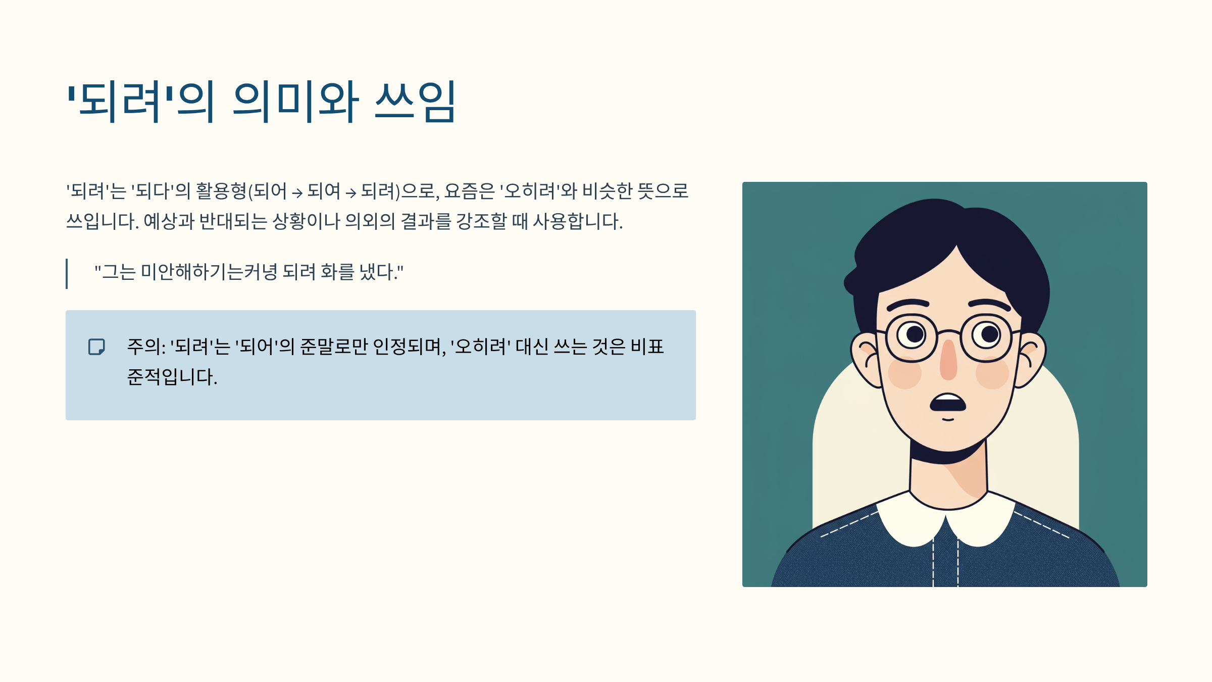 즉, 문법적으로는 ‘되려’를 ‘오히려’ 대신 쓰는 것은 비표준적이라는 점을 알아두면 좋습니다.