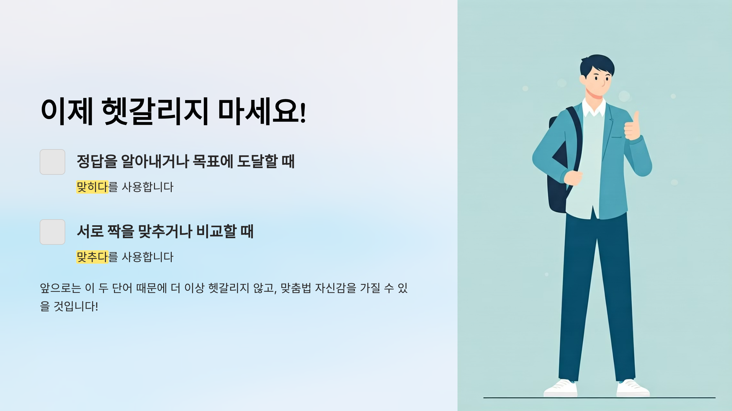 앞으로는 이 두 단어 때문에 더 이상 헷갈리지 않고, 맞춤법 자신감을 가질 수 있기를 바랍니다!
